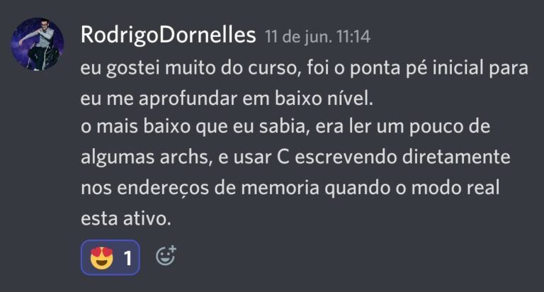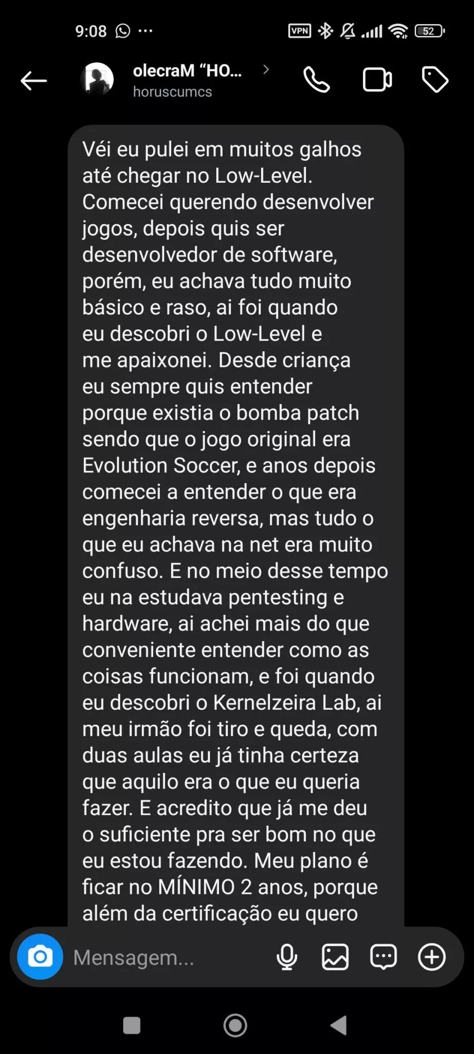 Atualmente, atuo como especialista de sistemas em uma grande empresa, e mesmo com uma rotina intensa, nunca deixei de estudar Baixo Nível e pesquisar vulnerabilidades de forma independente.